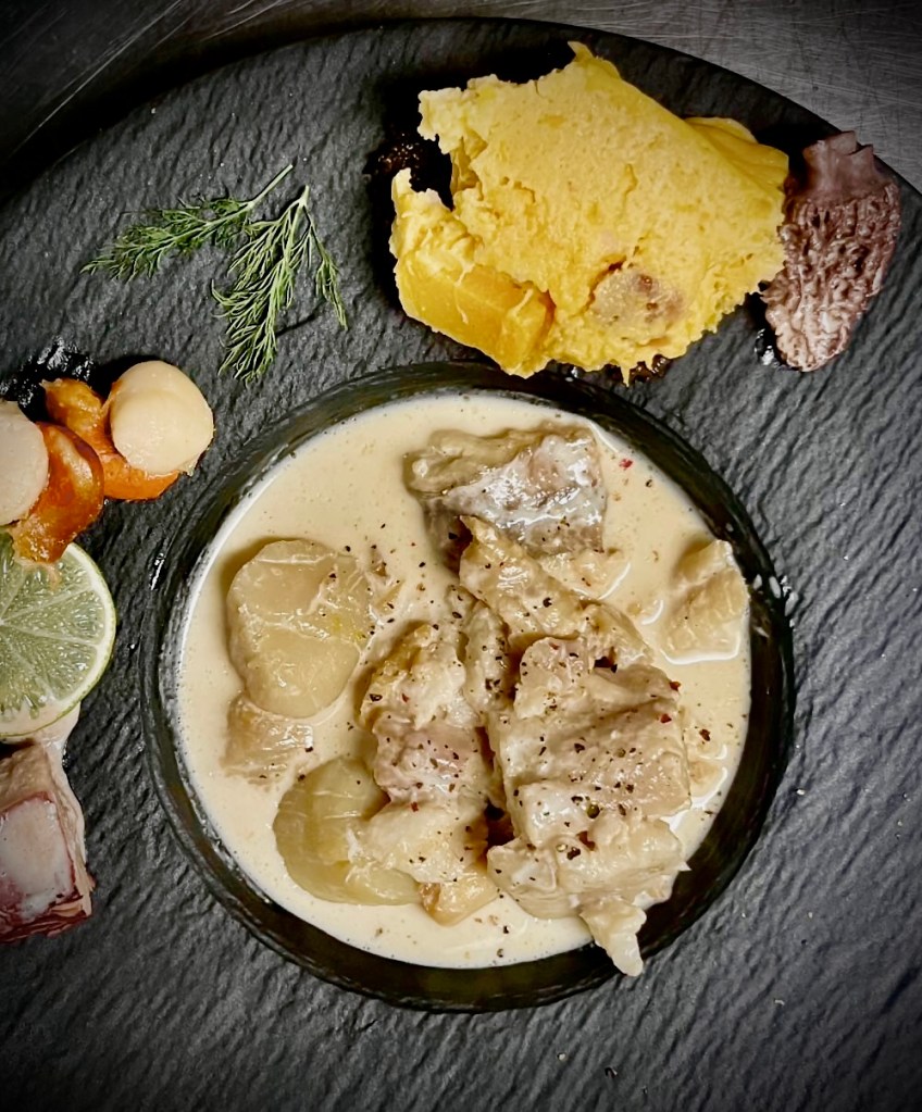 Depuis mon enfance, les seuls moments heureux où nous nous retrouvions tous ensemble, étaient les moments de partage autour d’un bon repas, avec les produits des fermes environnantes: les fruits du verger, le cochon partagé entre voisins, la poule après laquelle je courais et que ma grand-mère maternelle attrapait, le lapin dans les clapets à qui mon grand-père retirait « le pyjama » (…) et les heures de préparations et de cuisine pour que tous nous nous délections du moment… J’ai toujours tout fait pour retrouver ces instants de convivialité et même dans les moments plus difficiles, seule la priorité restait pour moi la qualité et la proximité des produits que je mangeais et que je cuisinais. C’est rendre ainsi hommage à ceux qui m’ont tant enseigné, ma famille.